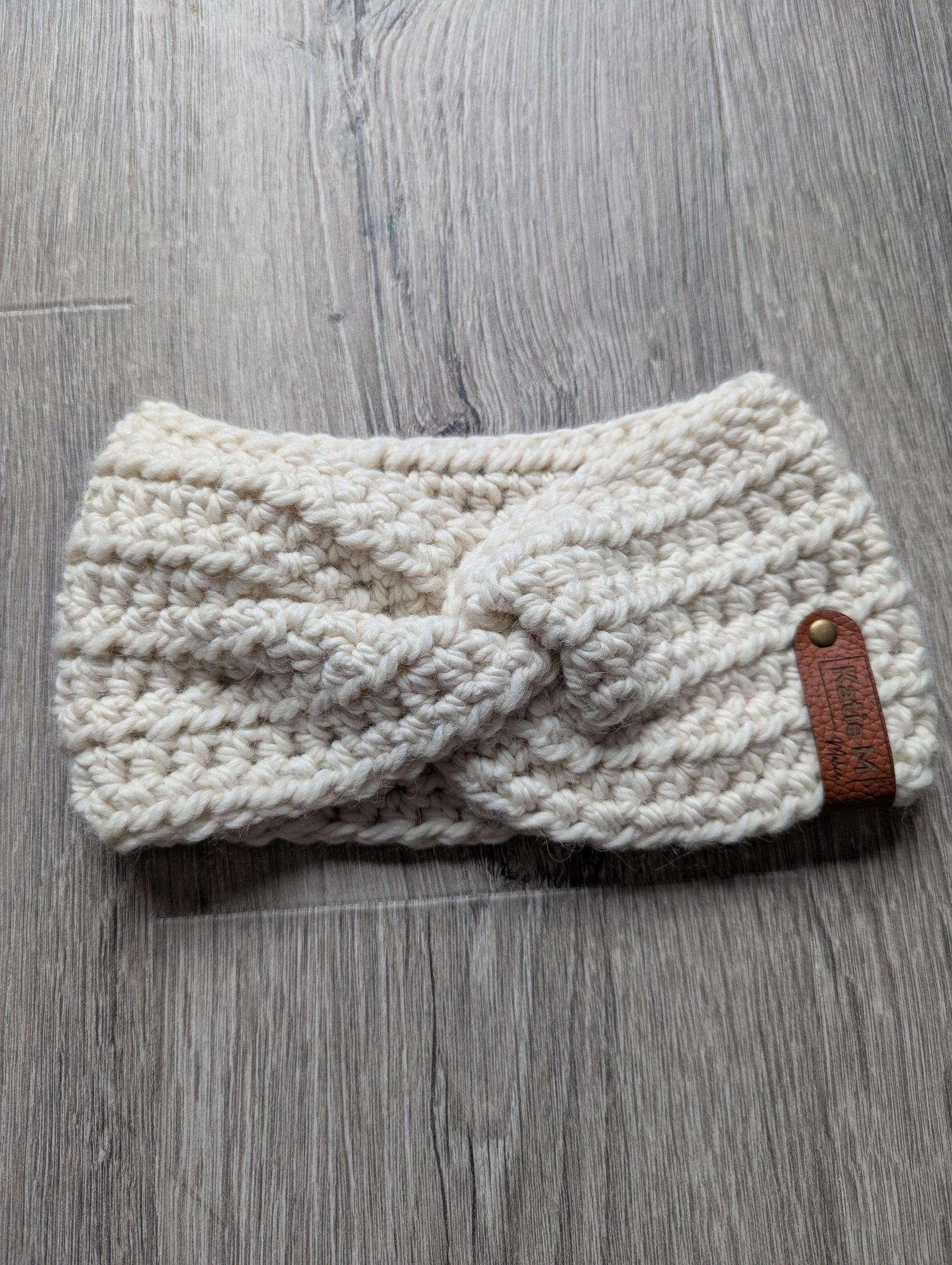Headband - 35% Alpaca, 65% wool yarn. Tag - vegan leather.